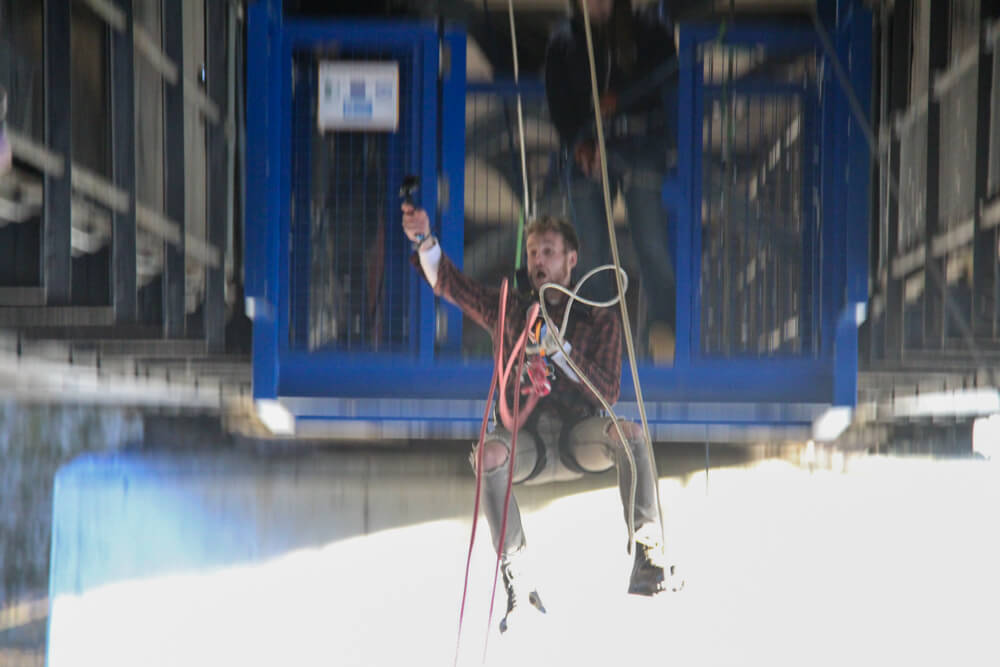 Make sure you are wearing sensible clothing and footwear, ie. nothing that can fall off or will be uncomfortable with a harness on. Once you have jumped you will be winched back up to the platform, a process that we discuss this in further detail below.